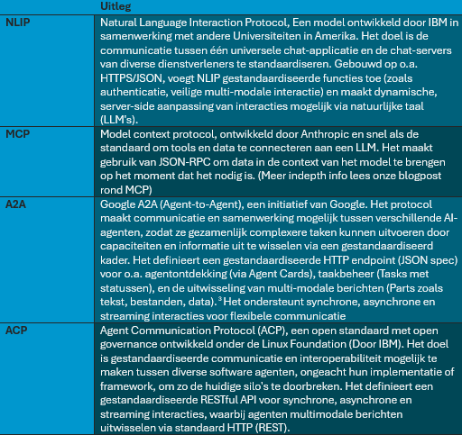 Nu weten we hoe we best aan de slag gaan met Agents al komt nu de vraag rond standaardisatie. We willen een systeem waarop iedere LLM kan inpluggen hier komen dan al die nieuwe protocollen naar boven