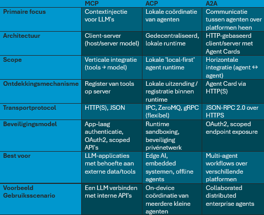 - ACP: Standaardiseert lokale coördinatie van agenten, vaak op hetzelfde apparaat of binnen een lokaal netwerk. Geschikt voor Edge AI, embedded systemen en offline agents.