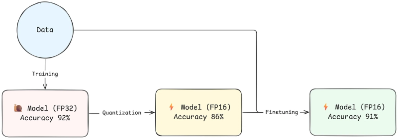 Wat men vaak doet is het gequantiseerde model nog eens kort hertrainen of finetunen. Dikwijls verhoogt dit de accuraatheid opnieuw naar het oorspronkelijke niveau van het niet-gequantiseerde model.