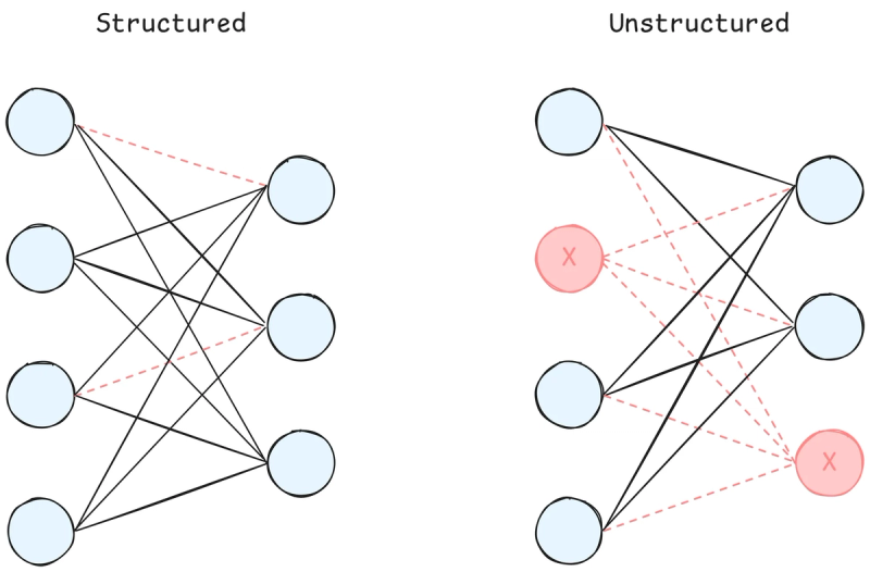 - Niet-gestructureerde pruning: verwijderen van individuele gewichten of verbindingen.