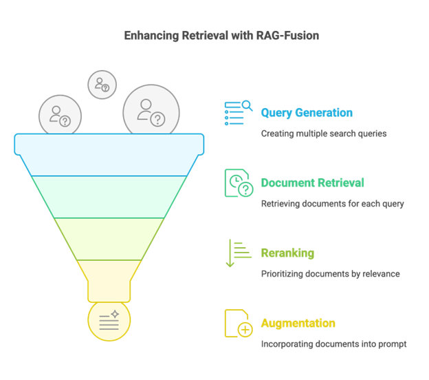 RAG-Fusion enhances the retrieval process by generating multiple search queries, retrieving documents for each, and then reranking them for optimal relevance. It works in three key steps: