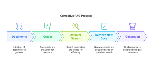 As the name suggests, Corrective RAG aims to improve the accuracy of the retrieval process by verifying the relevance of each retrieved document before it is used in the generation step.