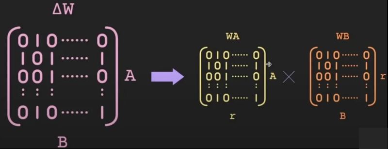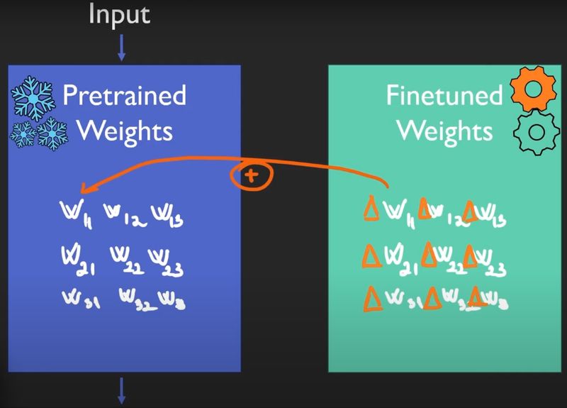 Concretely, the full weight matrix is not retrained, but a compact "delta matrix" that is split into two much smaller low-rank matrices. During inference, the model first calculates the answer with the original weights. The LoRA layers then add a limited, targeted adjustment to that.