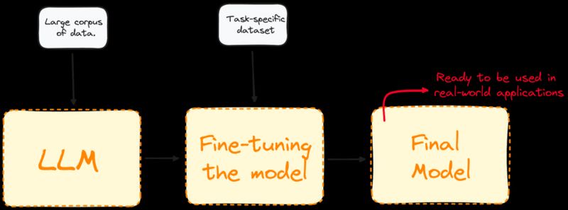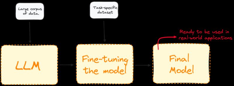 Finetuning is the process of further training an existing language model with a smaller, task-specific dataset. The figure below illustrates this as a simple flow: you start with a model that has learned from a large general corpus. By training it on your own data, its behavior is refined. This results in a final model that better fits concrete real-world applications.