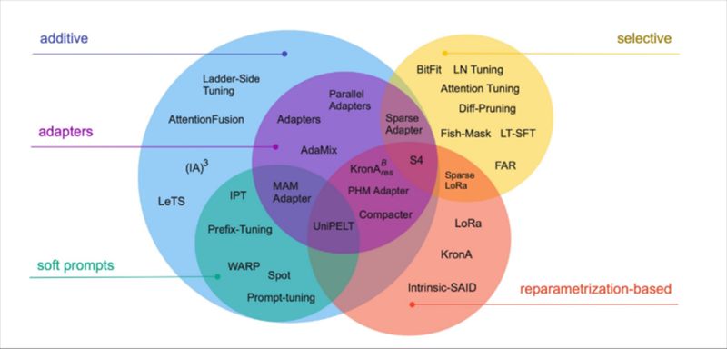 PEFT is a whole family of methods that you can use to efficiently retrain your model. The PEFT landscape is very broad. The central idea is that you do not retrain the entire model, but add small extensions.