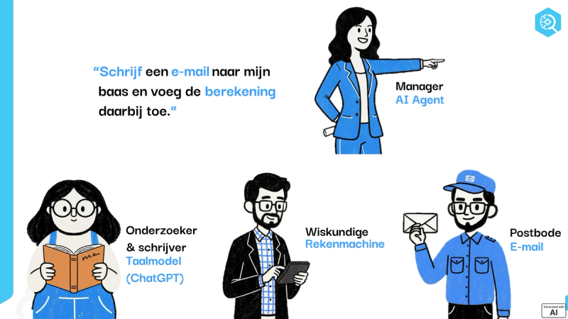 The first point we will look at is the definition of the word 'Agent'. For many, an Agent is a system that takes action on its own. Of course, there is always some kind of starting point or trigger. This can be receiving an email, a value on a sensor that becomes too high, or a simple start button. You can then ask yourself the following question.