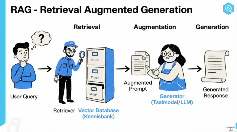 A next term is RAG or retrieval augmented generation. I don't want to go into too much technical detail here; you can see this as a way to use a language model with the extra limitation that it can only take the answer from various sources. Tools from Google Notebook LM are a good example of this. You can think of it as a kind of selection being made from documents and data to then provide this to the language model.