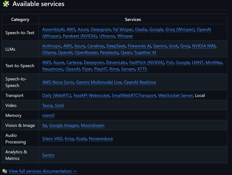 Eén van de sterke punten van Pipecat is de modulariteit van de services. Nieuwe modellen integreren in je bestaande pipeline? Geen probleem. Pipecat wordt voortdurend aangevuld met nieuwe standaardservices waarmee je eenvoudig connecteert met de nieuwste AI-modellen.
