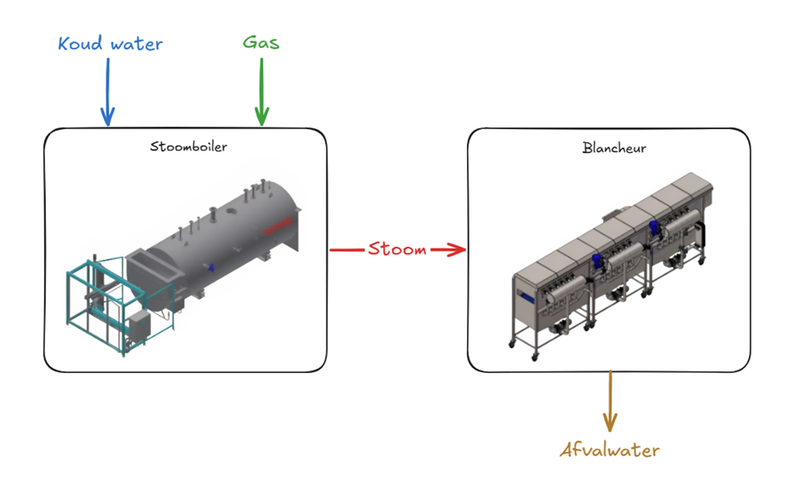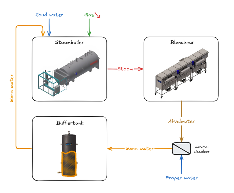 VEG-i-TEC beschikt over een blancheur, dit is een machine om frieten en groenten kort maar krachtig te stomen. Uit deze machine loopt heet afvalwater naar de riolering, maar hier zit nog heel wat thermische energie in.